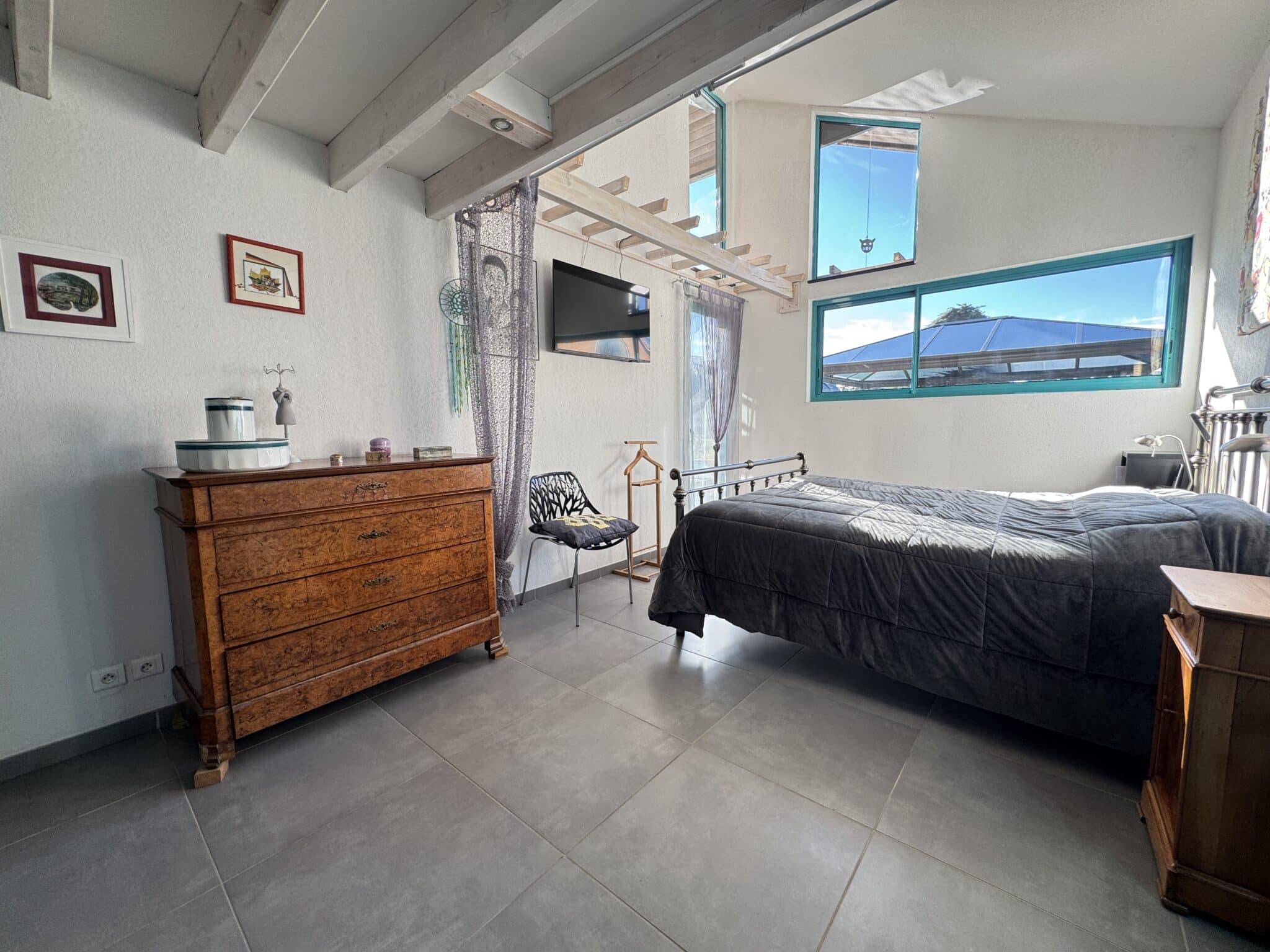 Implantée sur un terrain paysagé et arboré de près de 2 000 m², la maison bénéficie d’une orientation privilégiée vers les Pyrénées, offrant une luminosité exceptionnelle à toute heure de la journée. Les larges ouvertures mettent en scène la nature environnante et créent une atmosphère chaleureuse et apaisante.