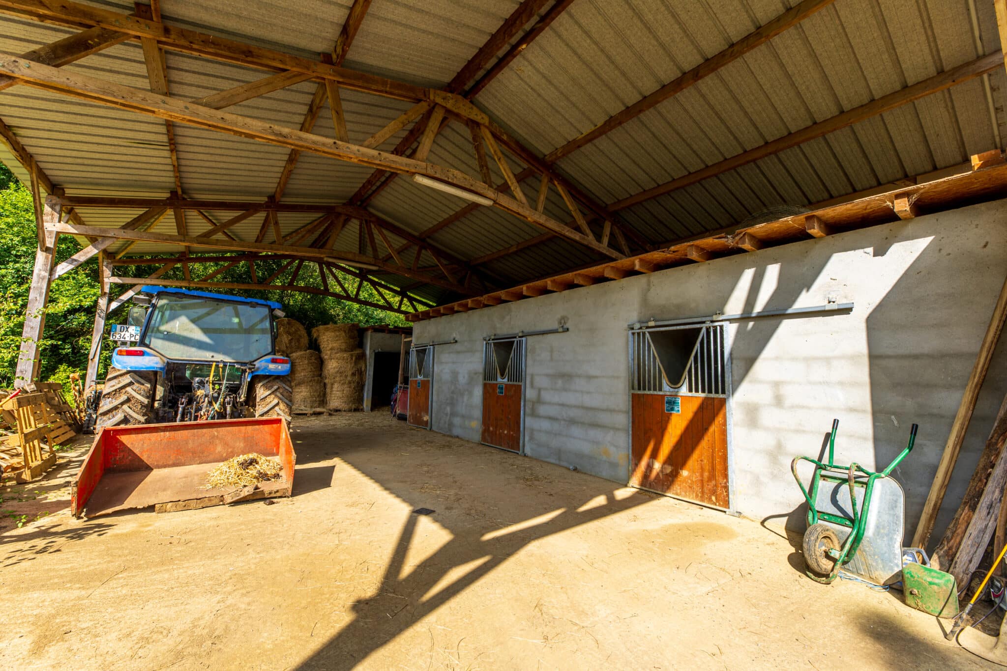 Datant du XVIe siècle et partiellement rénovée, la maison principale développe plus de 360 m² habitables, où le cachet de l’ancien a été préservé : poutres apparentes, pierres d’origine et volumes généreux. De nombreuses dépendances viennent compléter cet ensemble, dont un hangar équipé de plusieurs box, parfait pour une activité équestre.