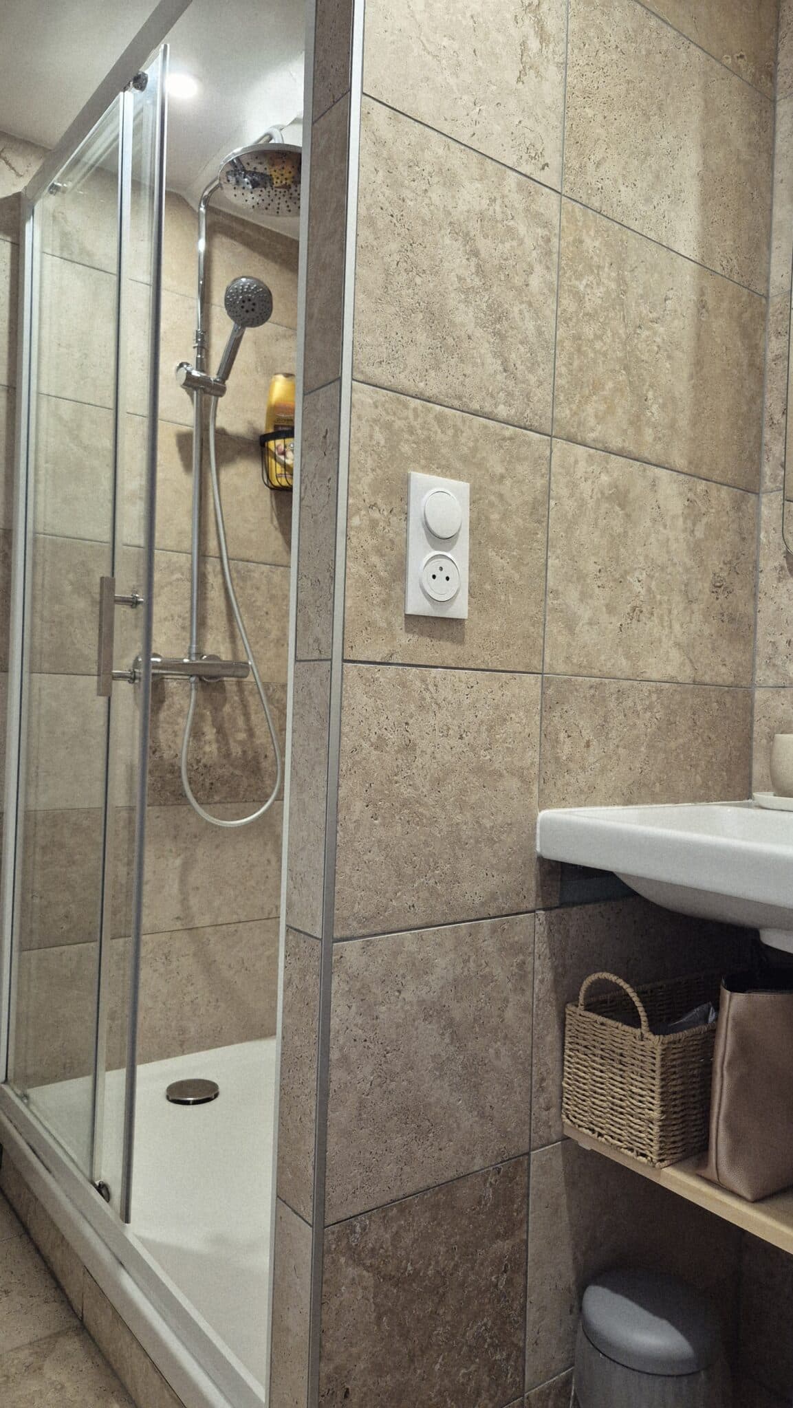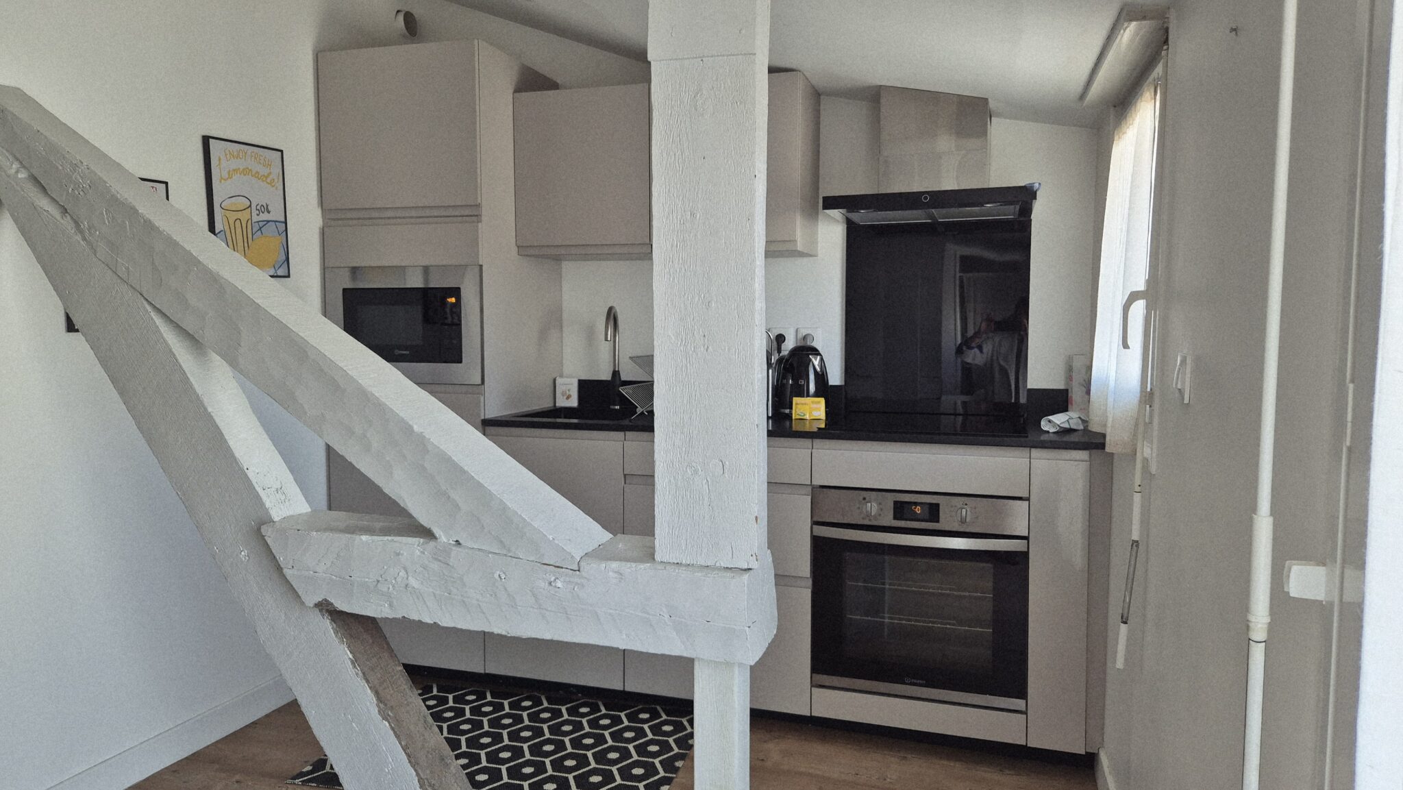 Cuisine moderne équipée (four, micro-ondes, plaques), coin nuit cosy et salle d’eau contemporaine.