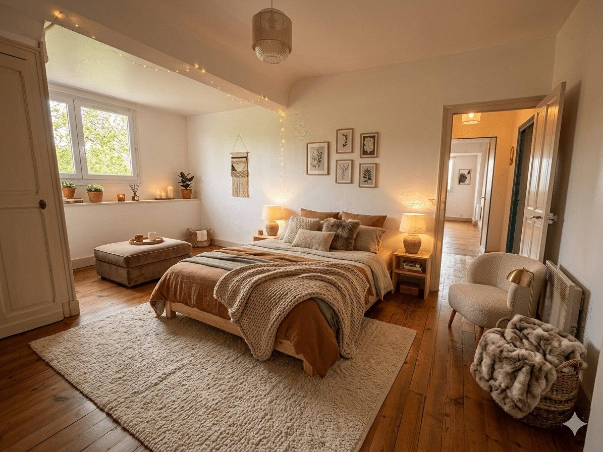 L’appartement, baigné de lumière, dispose de parquets anciens sur l’ensemble des pièces, créant une ambiance chaleureuse.