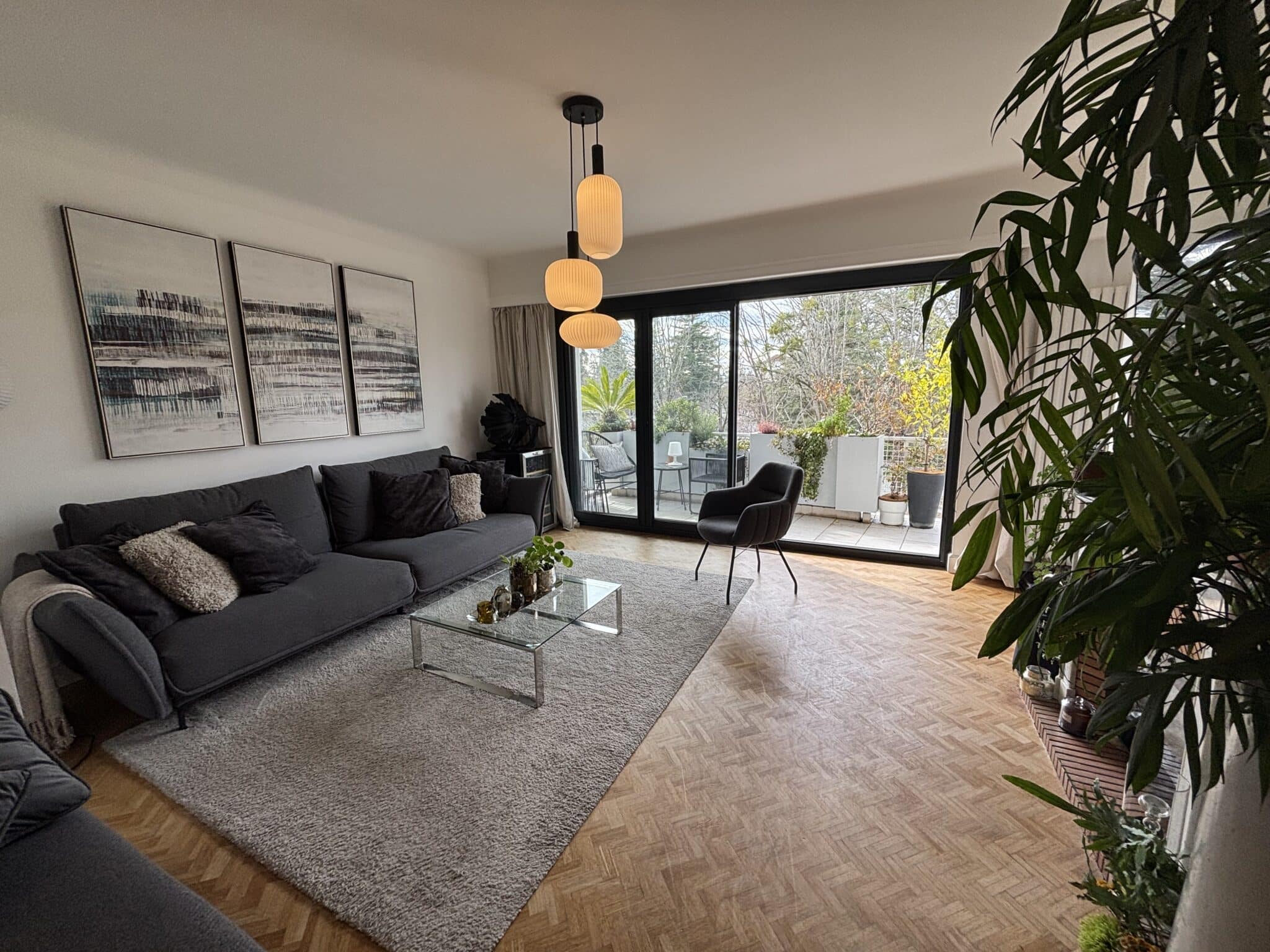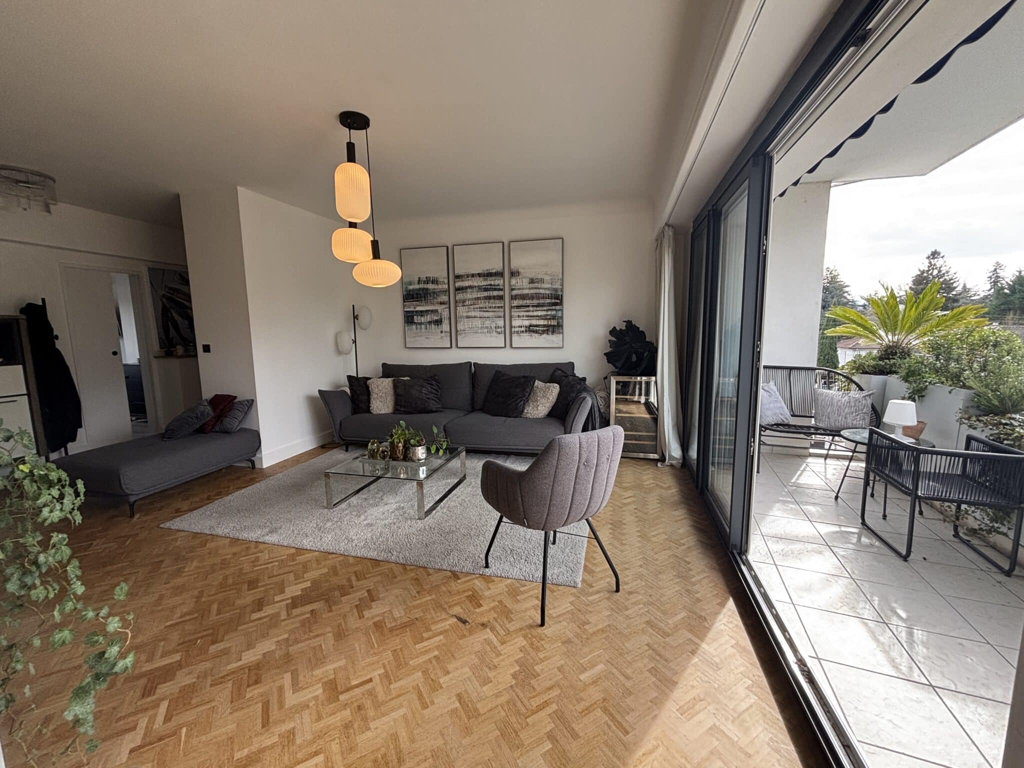 Dès l’entrée, les volumes et la luminosité séduisent. Le grand séjour, chaleureux avec son parquet au sol, s’ouvre sur un vaste balcon sans vis-à-vis, offrant de beaux aperçus sur les Pyrénées et la verdure. Un véritable espace de vie, idéal pour recevoir ou profiter du calme environnant.