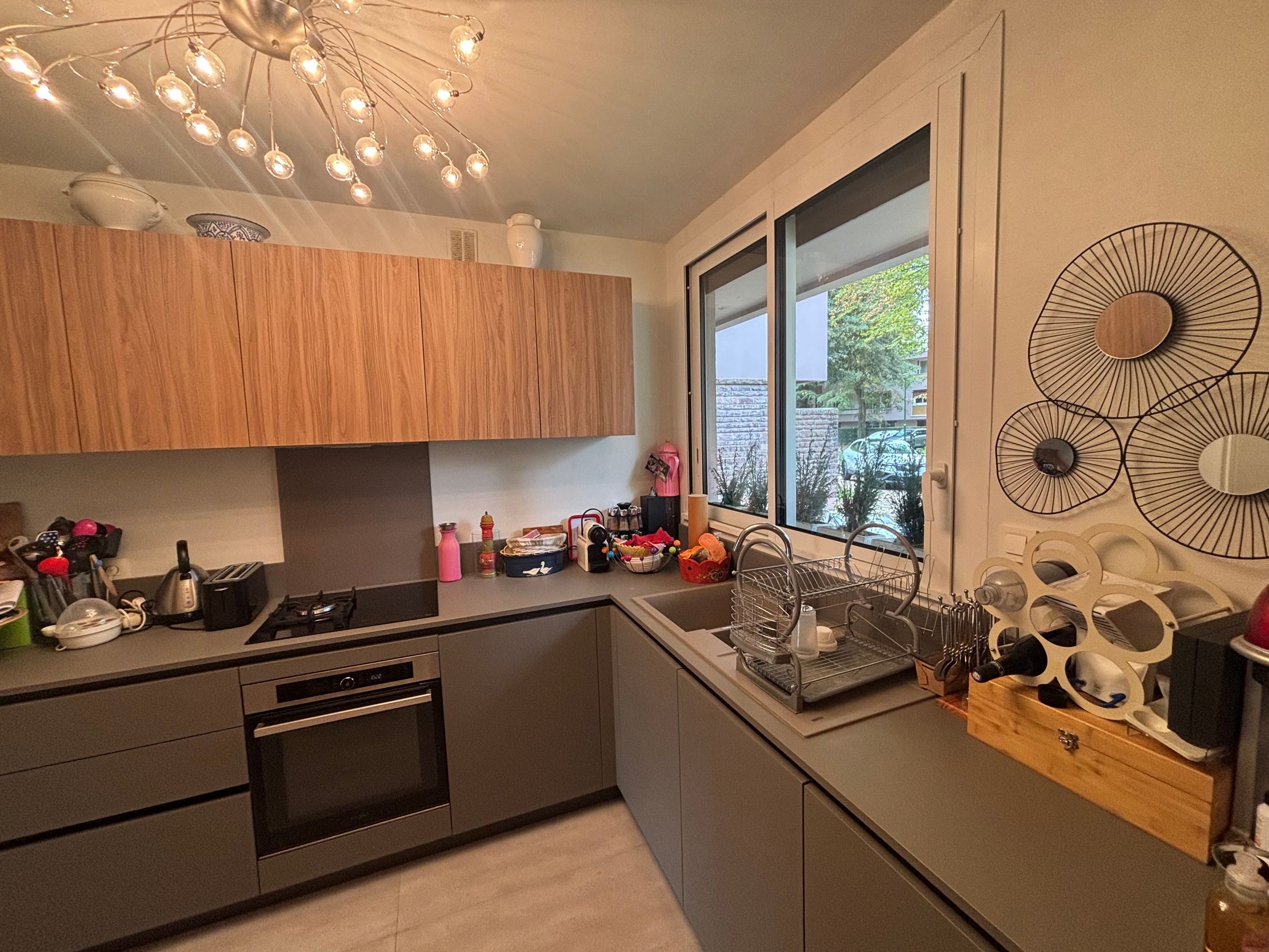 Le rez-de-jardin s’ouvre sur un vaste séjour de 43 m², baigné de lumière, prolongeant naturellement la vie intérieure vers une agréable terrasse entourée de verdure et le jardin de 80m².