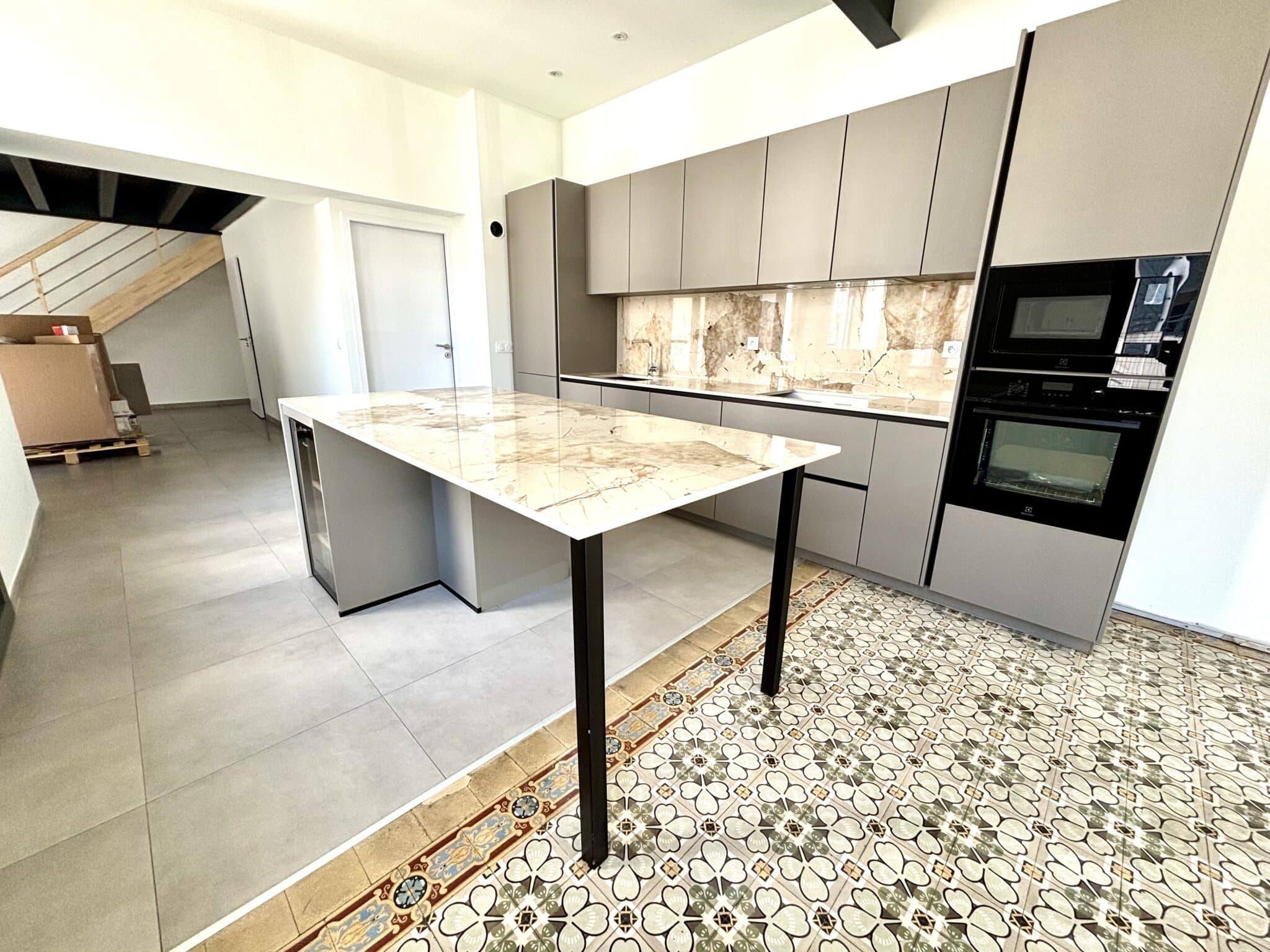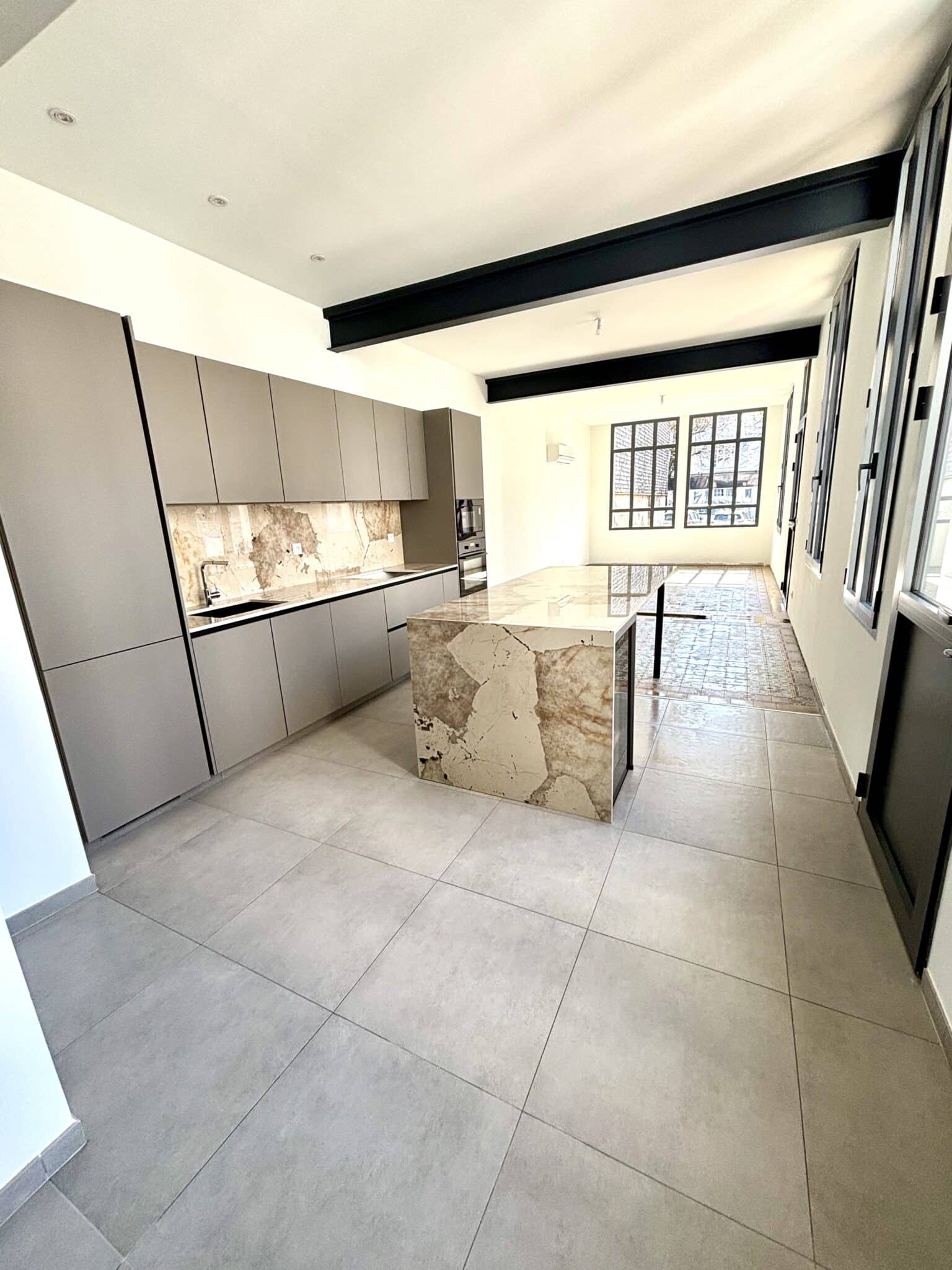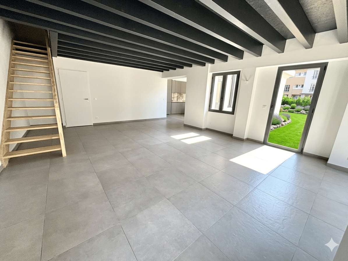 Dès le rez-de-chaussée, le ton est donné par une vaste pièce de vie magistrale, véritable cœur de la demeure, où s’intègre une cuisine haut de gamme aux lignes épurées. Cet espace de réception s’ouvre sur un jardin privatif, un luxe rare qui permet de profiter d’un extérieur en plein centre-ville.