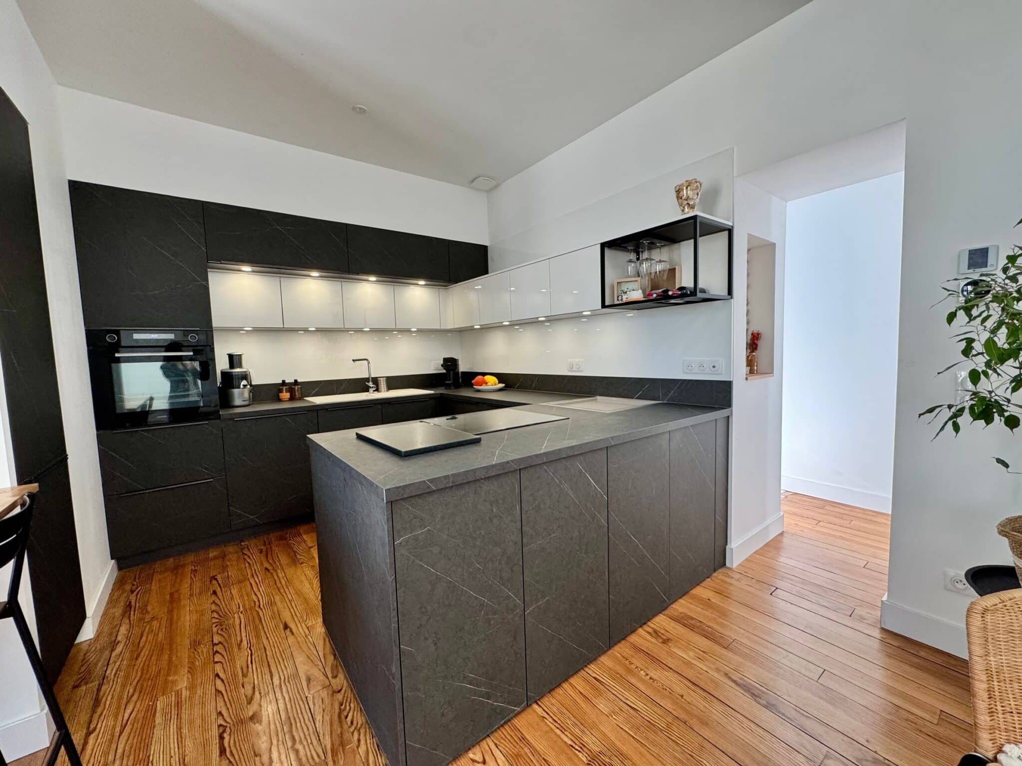 Chaque détail a été pensé avec soin : parquets en bois massif, belle hauteur sous plafond, matériaux nobles et finition irréprochable confèrent à cet espace une atmosphère à la fois contemporaine et élégante.