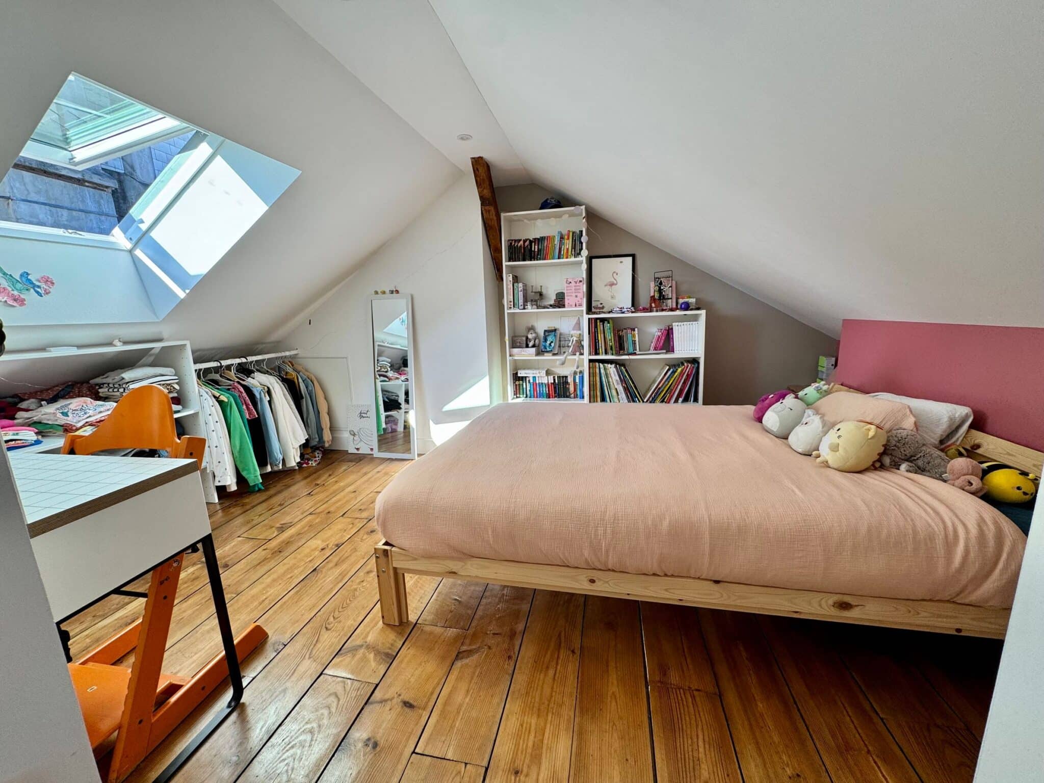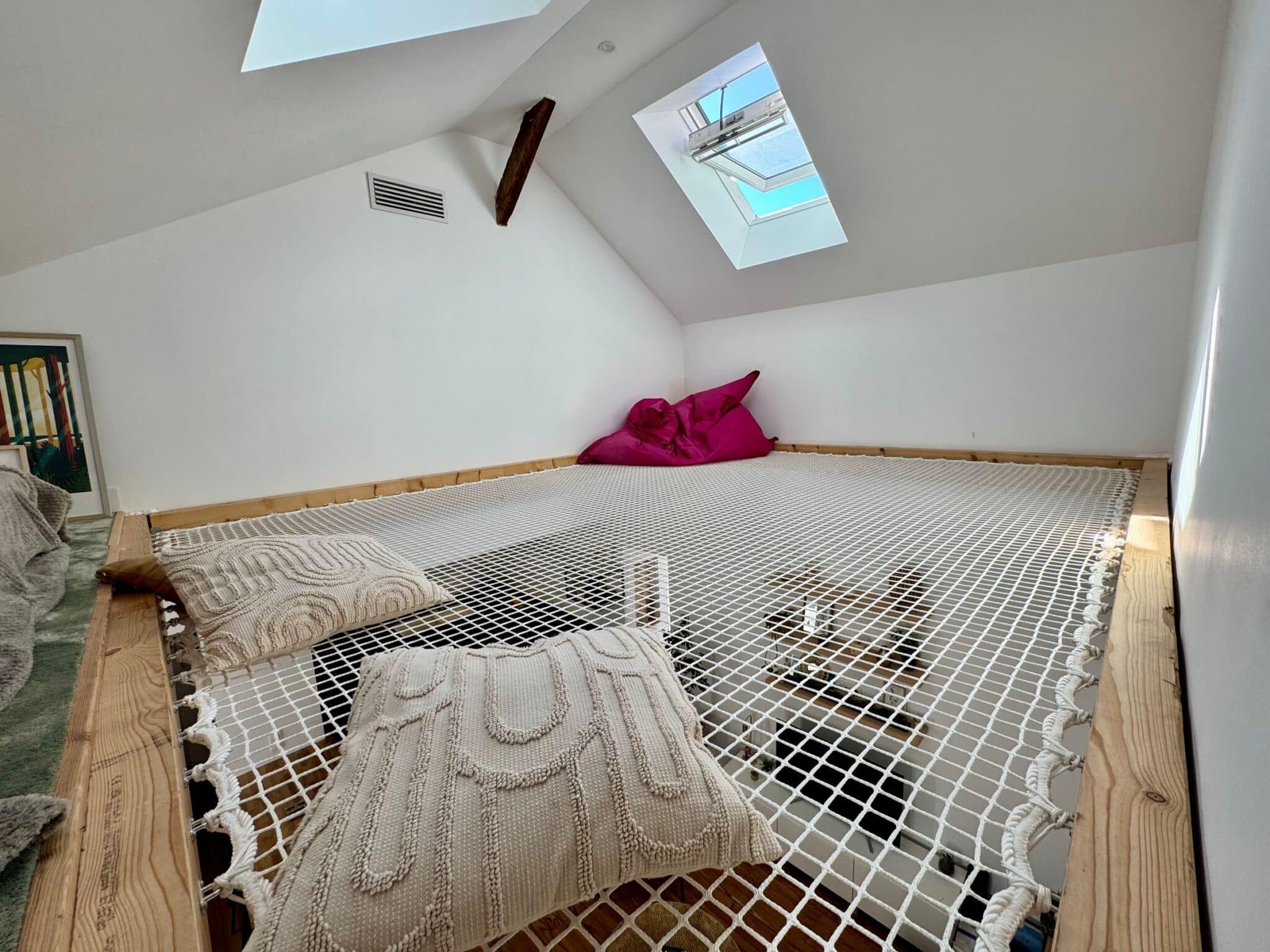 A l’étage, vous trouverez une charmante chambre climatisée, véritable « nid douillet » sous les toits avec sa salle d’eau et son WC suivi d’un espace détente et « chilling » sur filet suspendu qui fera la joie des enfants et des grands…
