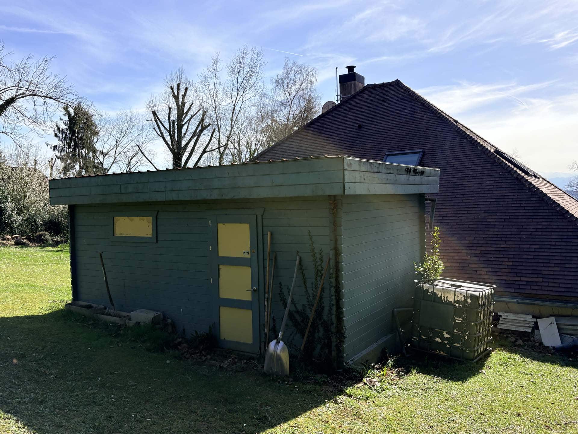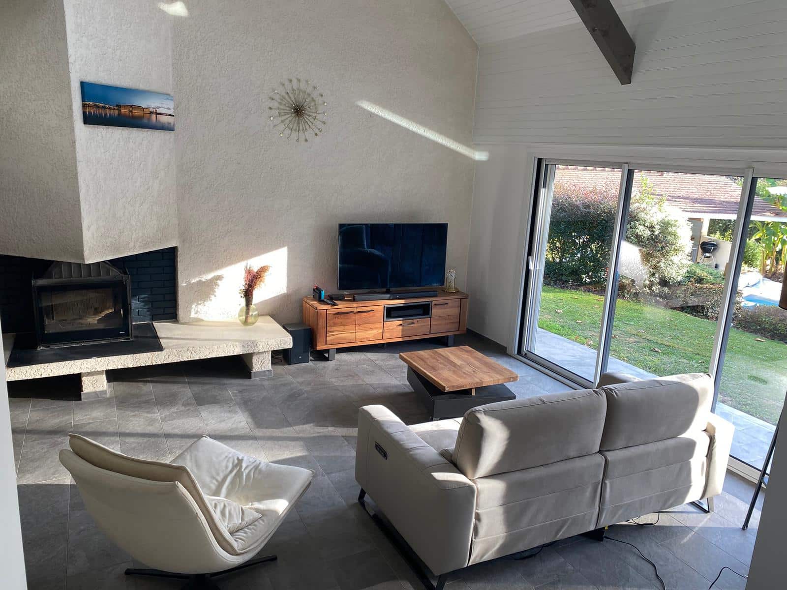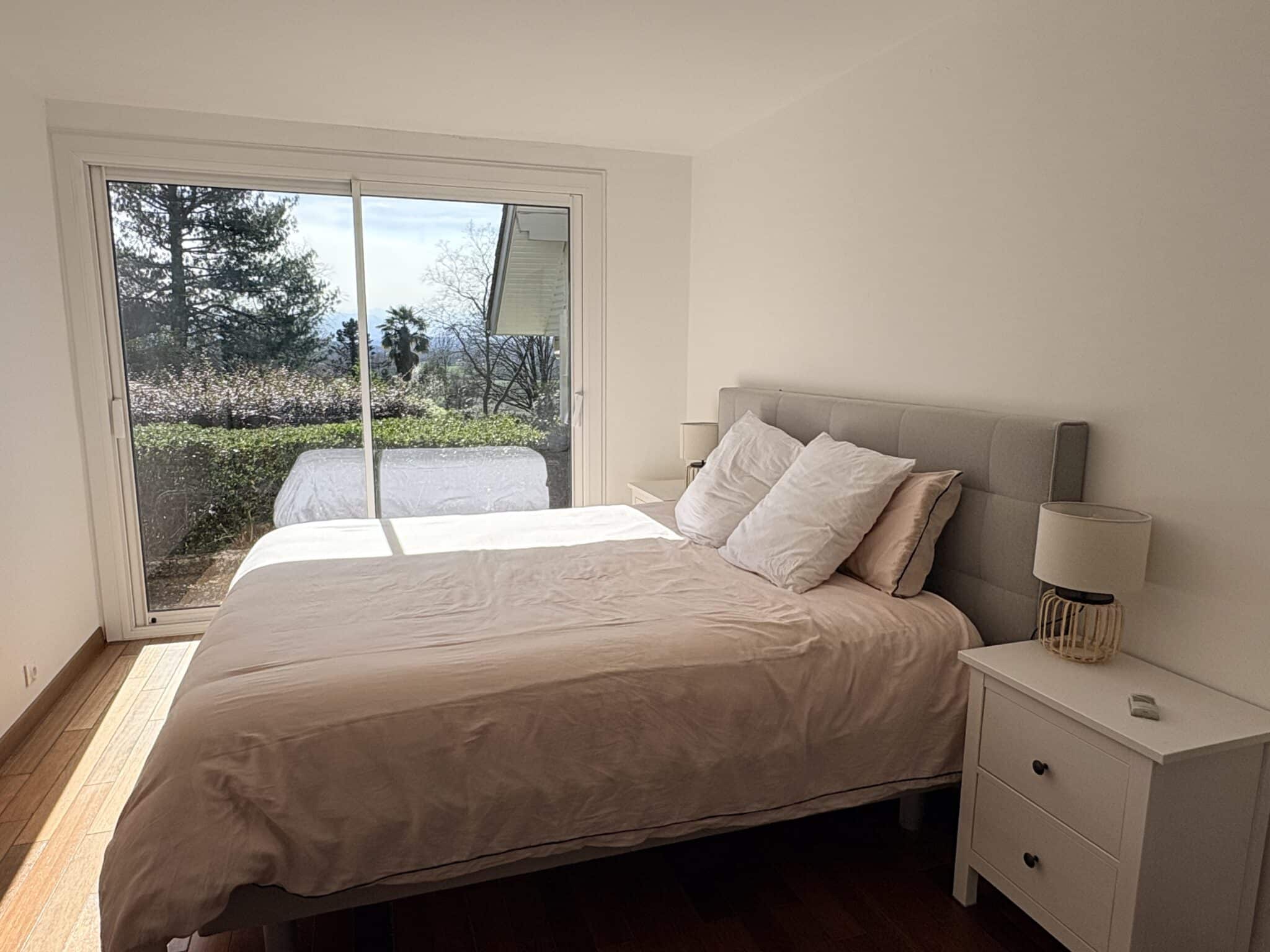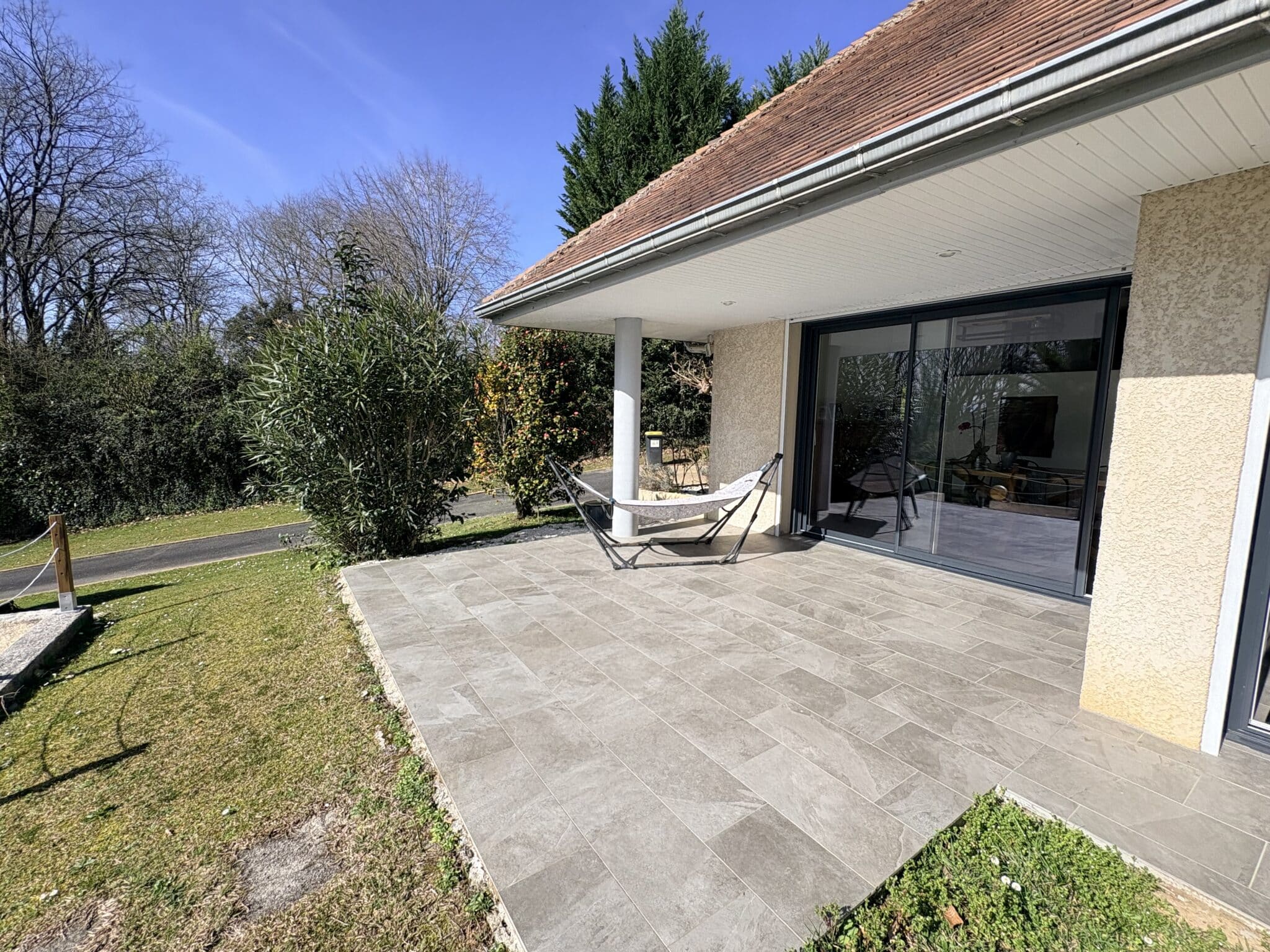 Une terrasse attenante à la pièce de vie permet de profiter pleinement de la vue sur le jardin et sur les Pyrénées.