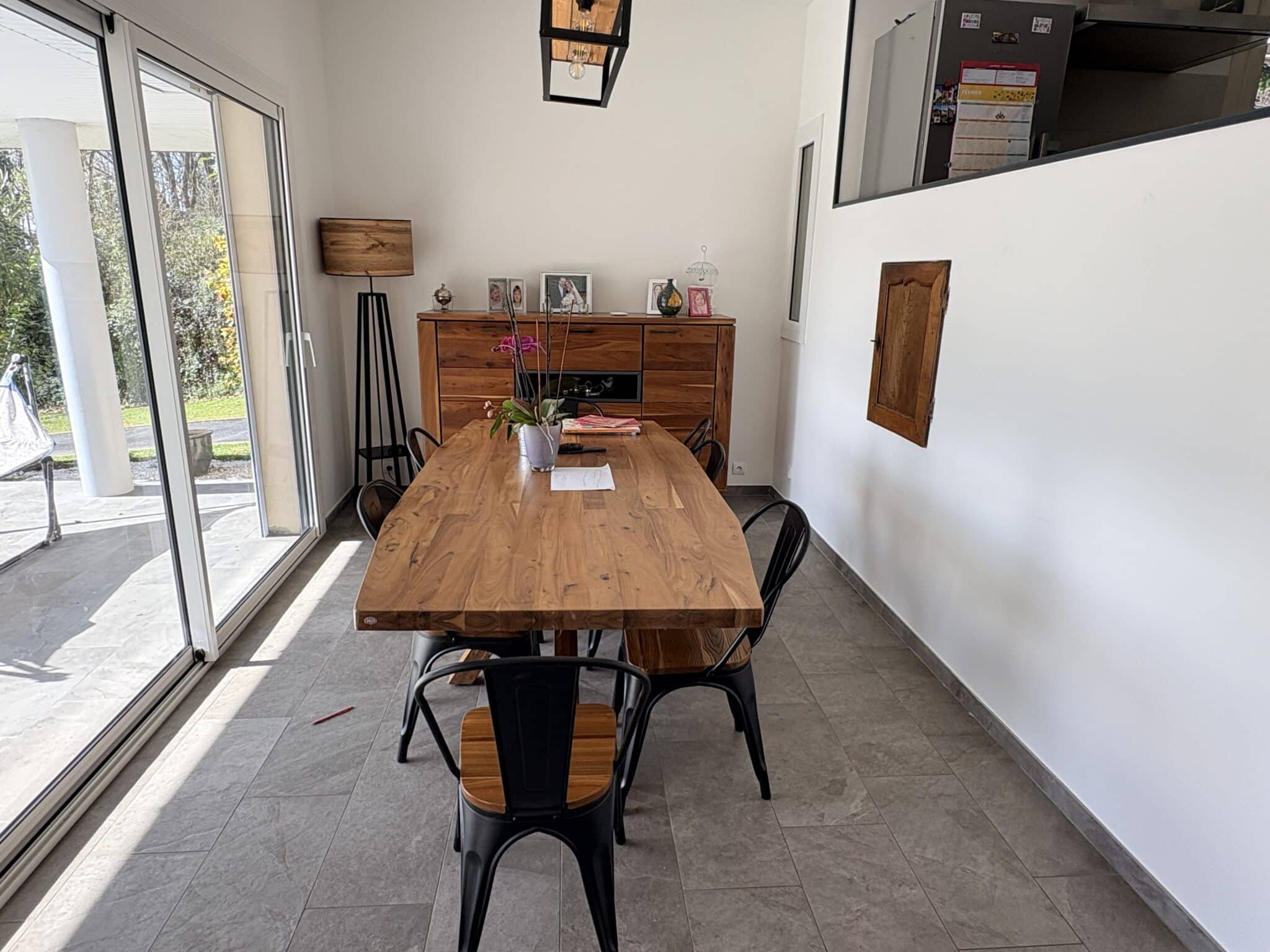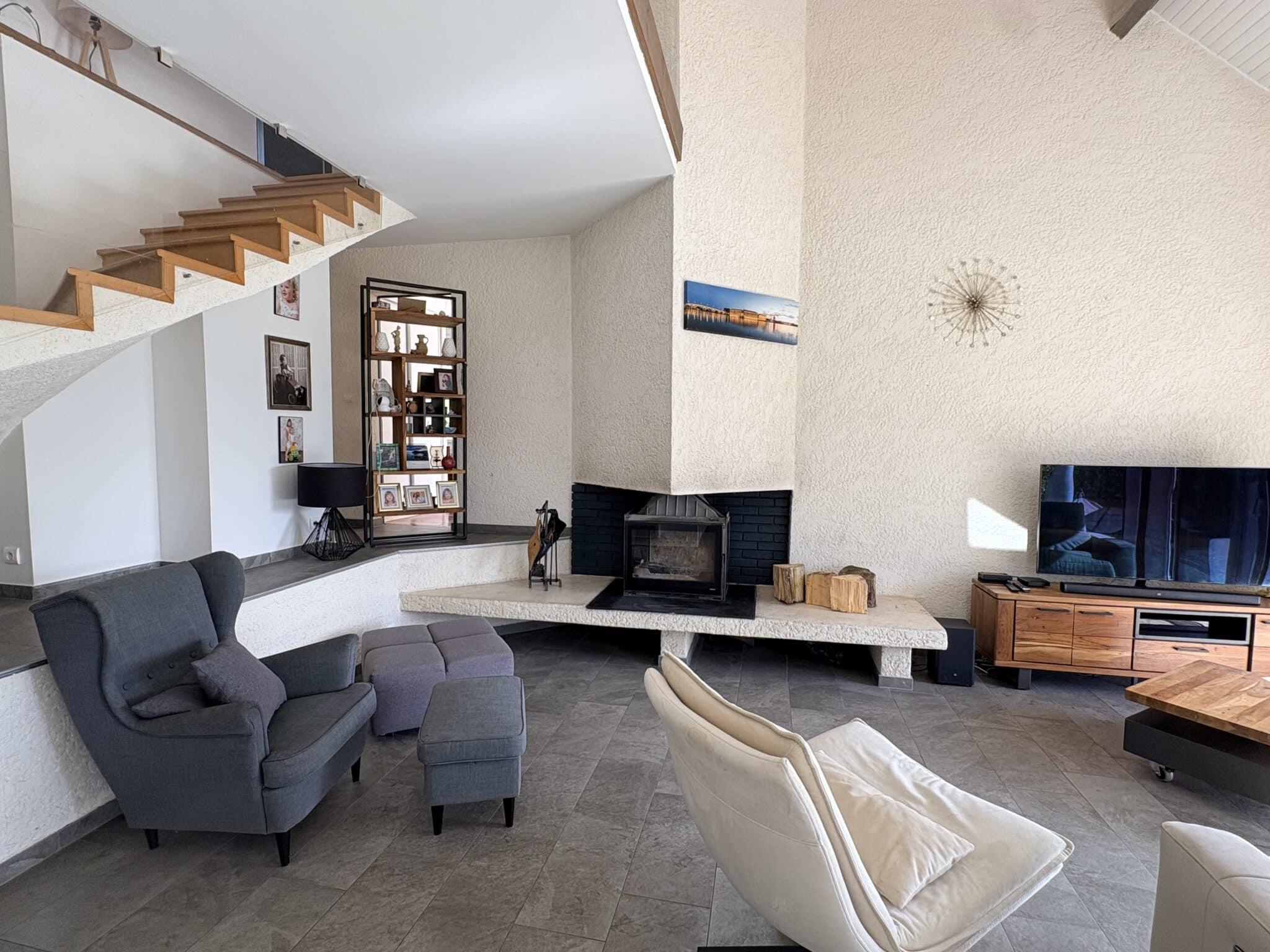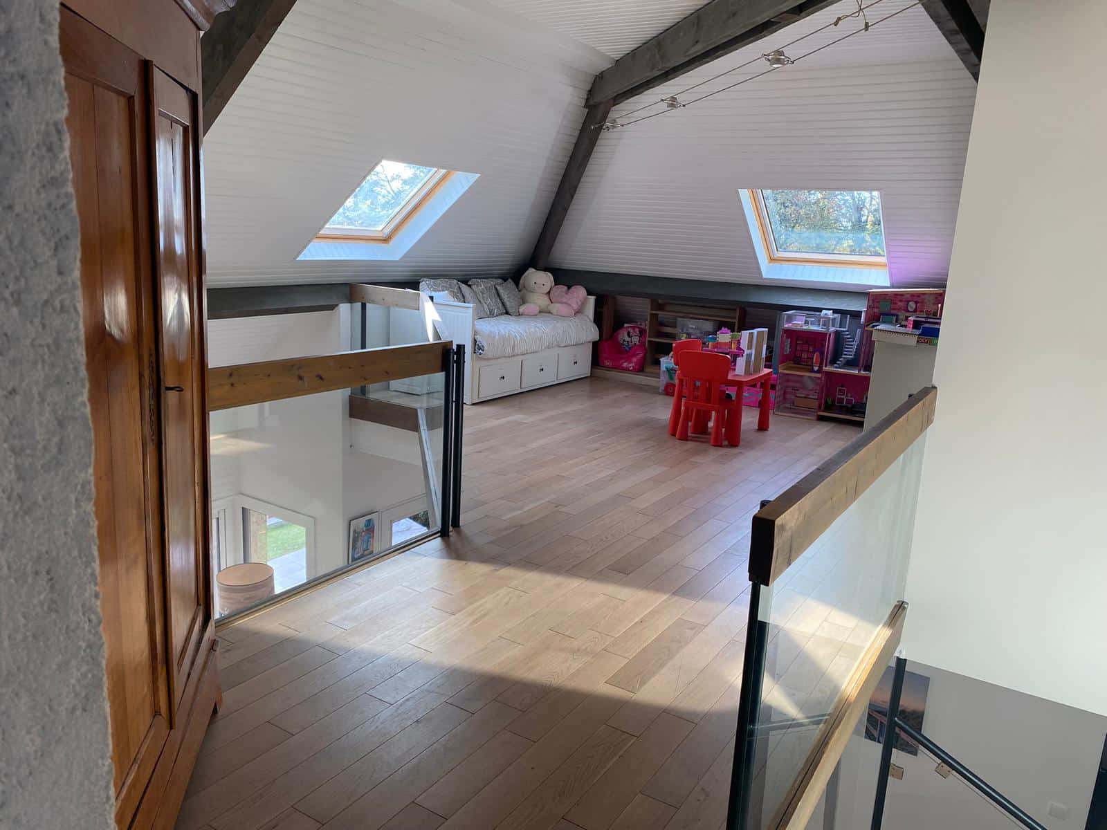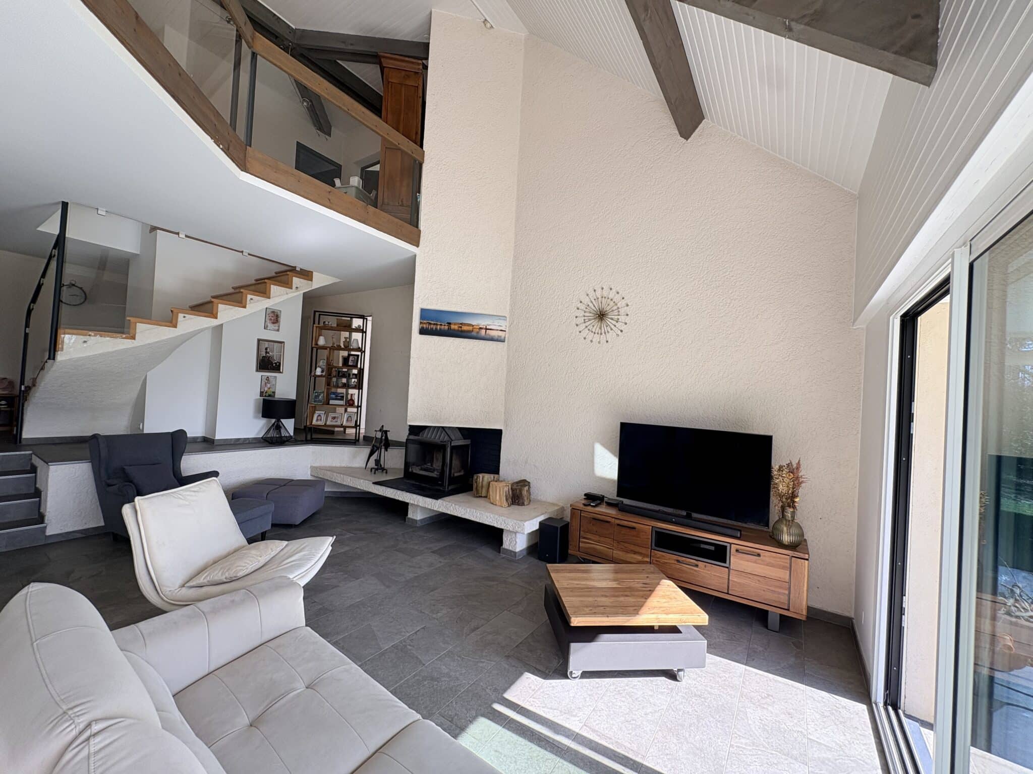 La maison se compose d’un salon/salle à manger avec toit cathédrale et insert, d’une cuisine semi-ouverte, de quatre chambres, dont deux à l’étage, d’une grande mezzanine et de deux salles de bains et une salle d’eau.
